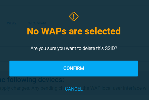 To delete an SSID, edit the “Wireless Network,” and un-select all access points assigned to this SSID. Select save.